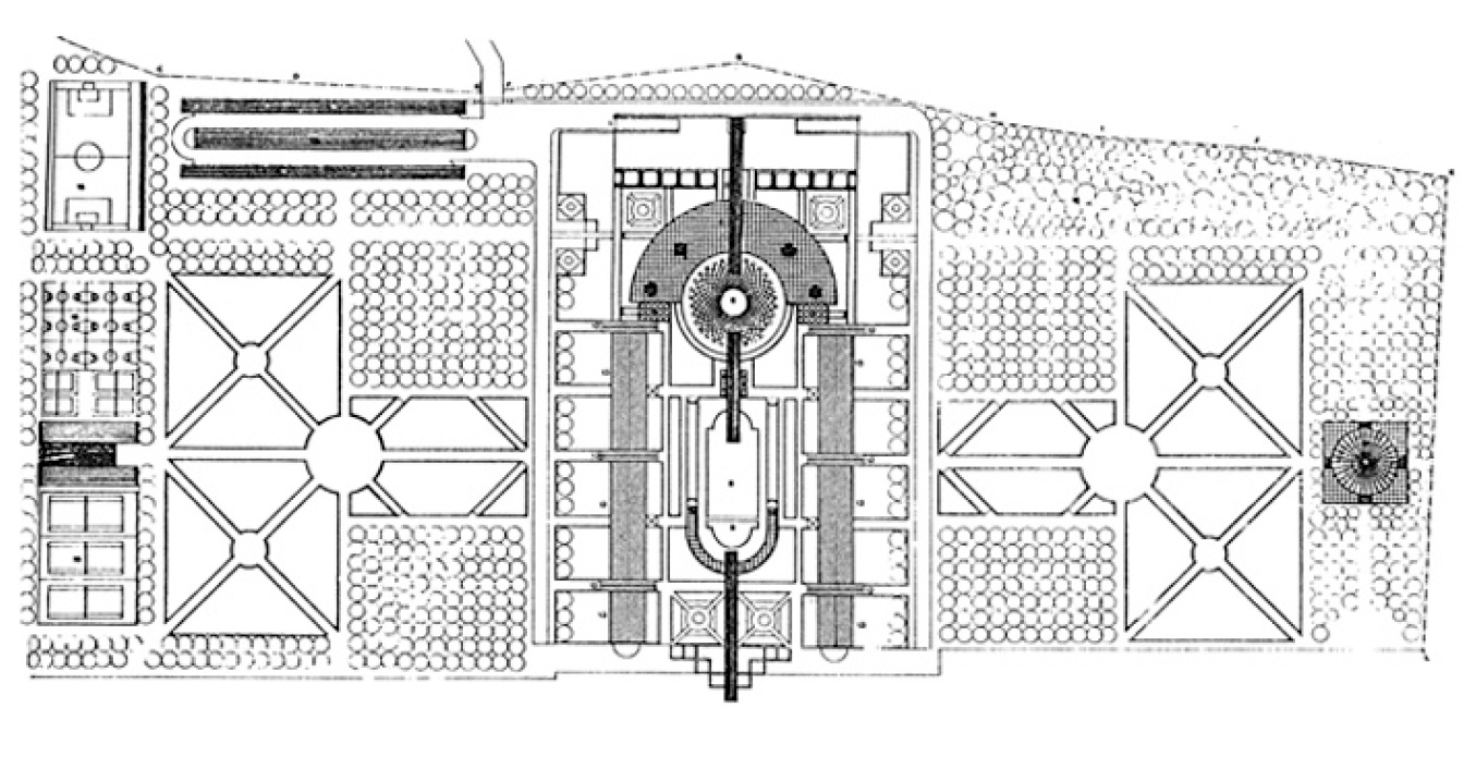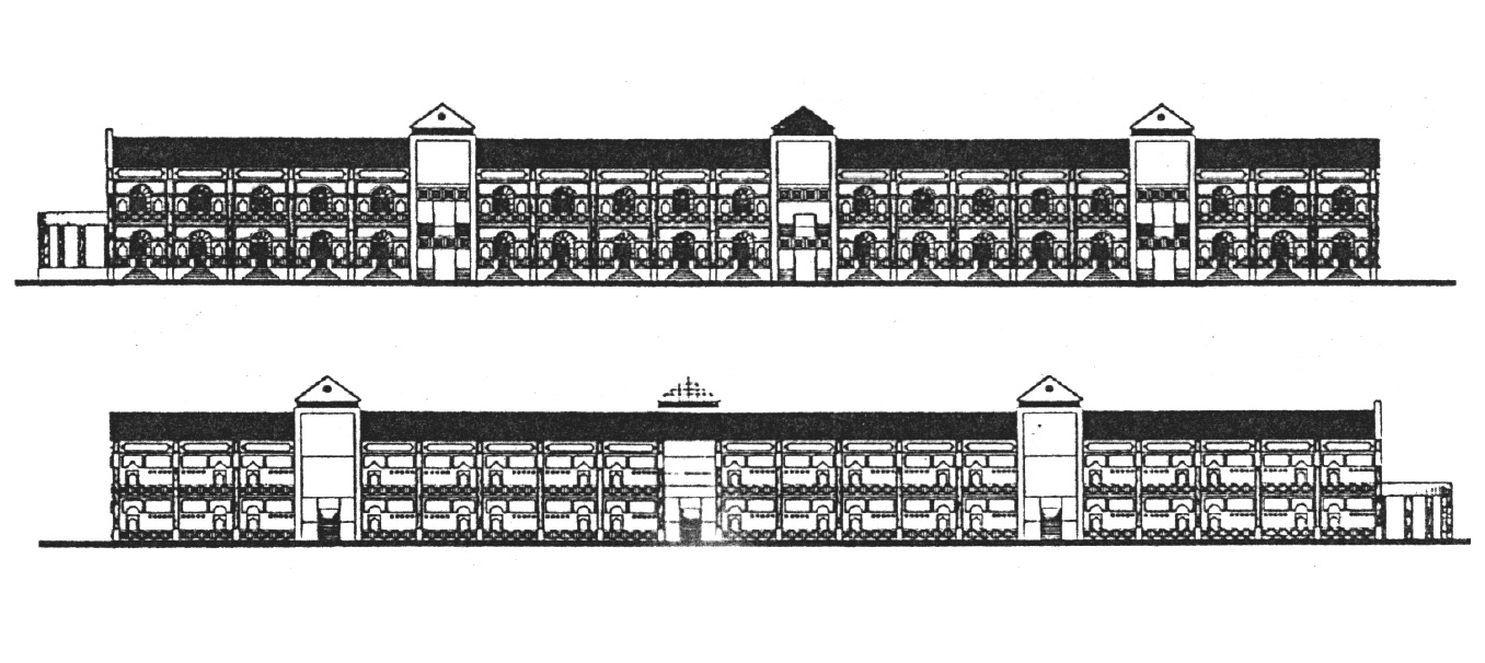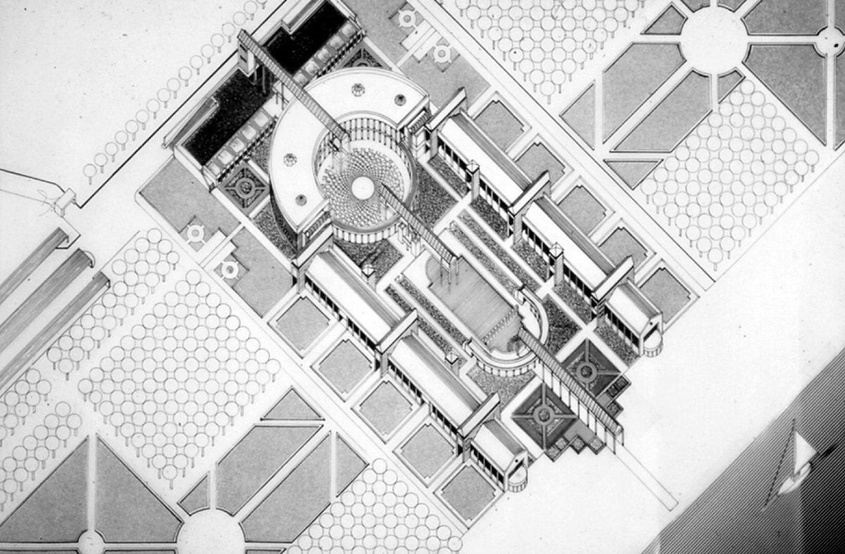 Η ξενοδοχειακή μονάδα οργανώνεται γύρω από ένα κεντρικό χώρο με τις κοινόχρηστες λειτουργίες της αναψυχής και της κατανάλωσης. Σε σχέση με ένα άξονα συμμετρίας διατάσσονται τόσο τα κτίρια των δωματίων με στοά και με τους ημιυπαίθριους πύργους των κλιμακοστασίων, όσο και το ημικυκλικό διώροφο κτίριο των κοινόχρηστων λειτουργιών. O άξονας συμμετρίας επιλύεται ως εμφατική στεγασμένη διαδρομή. O κεντρικός χώρος εμπεριέχει μία κυκλική πλατεία με κυκλική στοά, ένα πύργο (αναψυκτήριο, bar) και ένα ημικυκλικό κτίριο (αναψυκτήριο, disco) που λειτουργεί ως όριο προς τη θάλασσα. Στον υπαίθριο χώρο του οικοπέδου, ο σχεδιασμός παραπέμπει σε “σχέδιο πόλης” στο οποίο εντάσσονται μικρότερα “κτίρια” αθλητισμού, παιχνιδιού, όπως επίσης και “οικοδομικά τετράγωνα” με πράσινο.