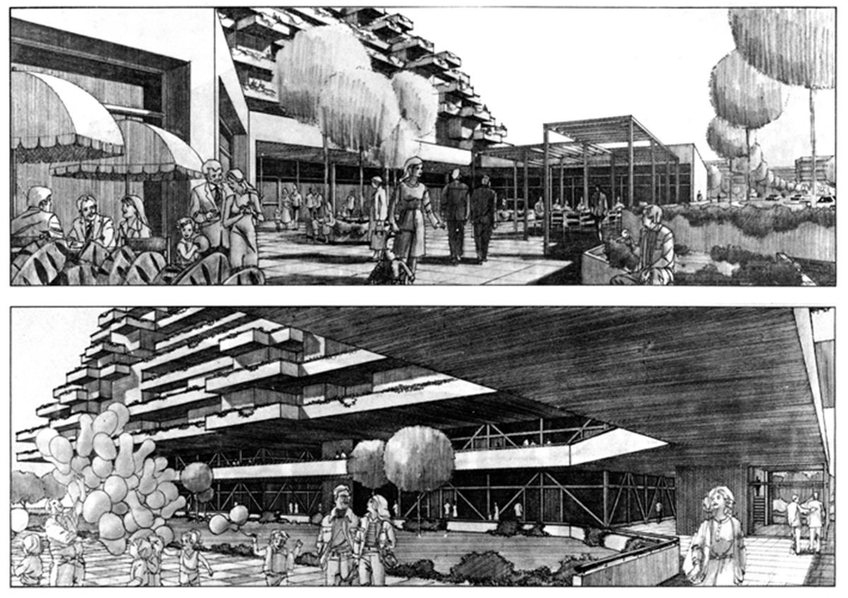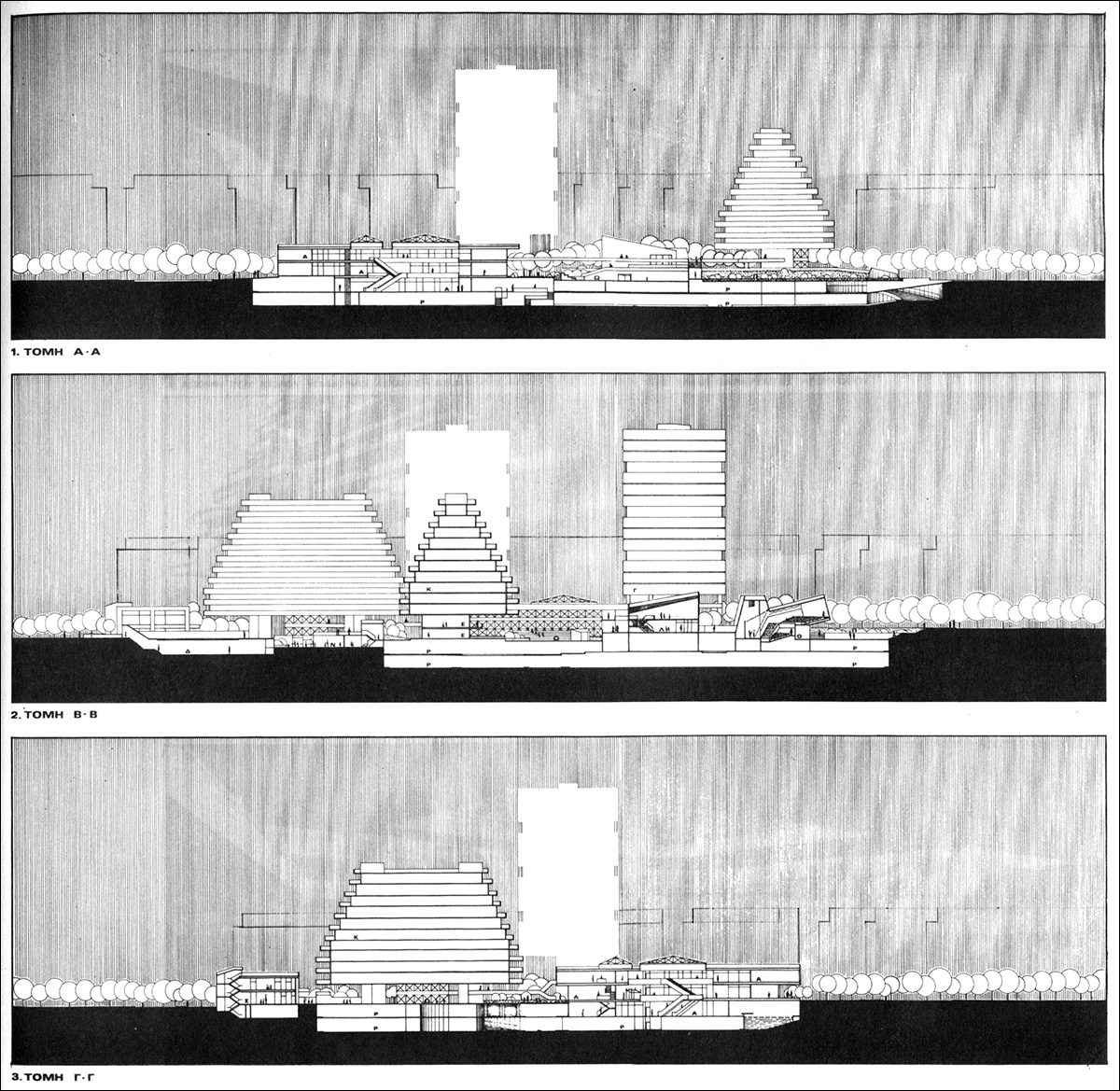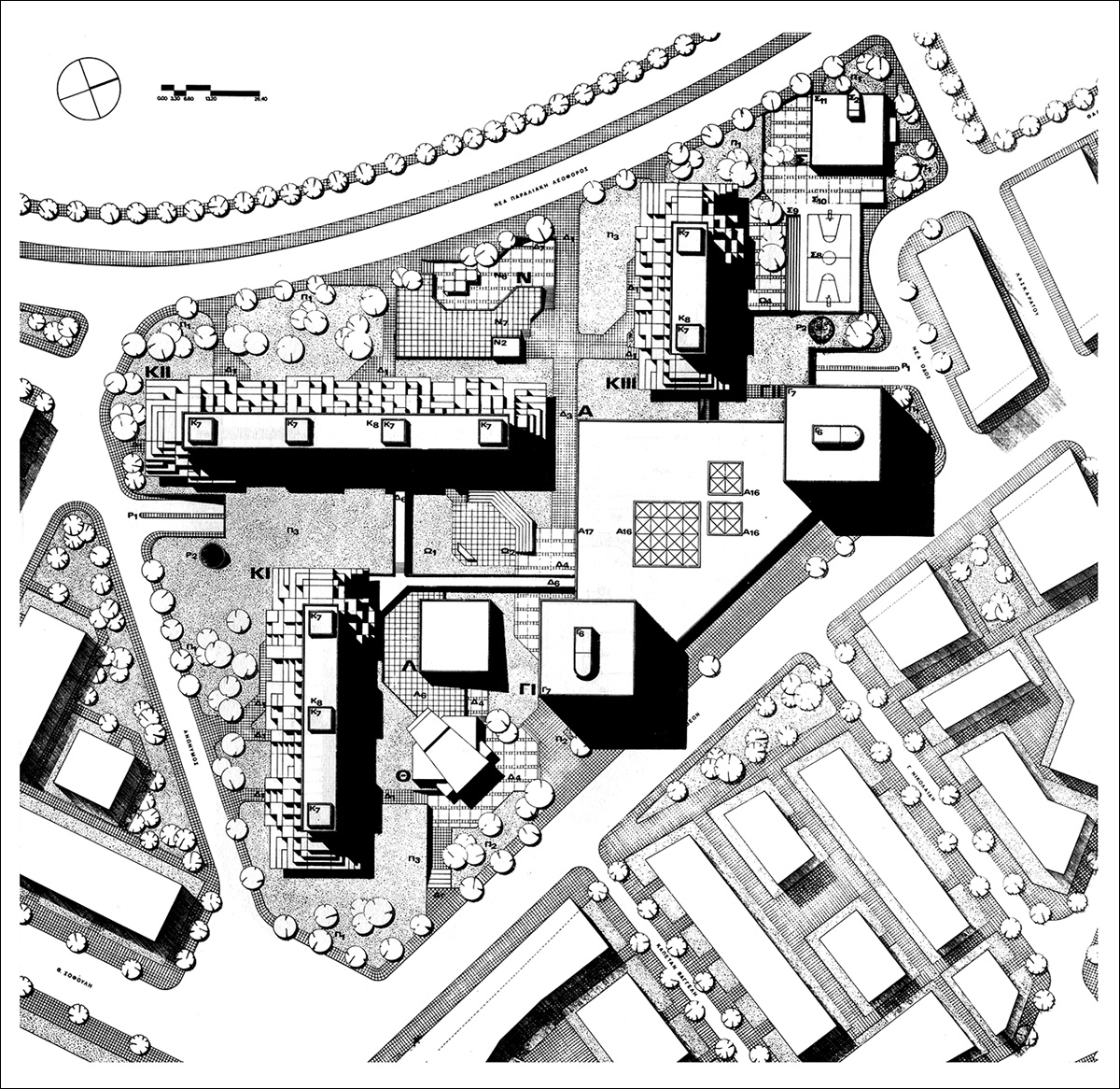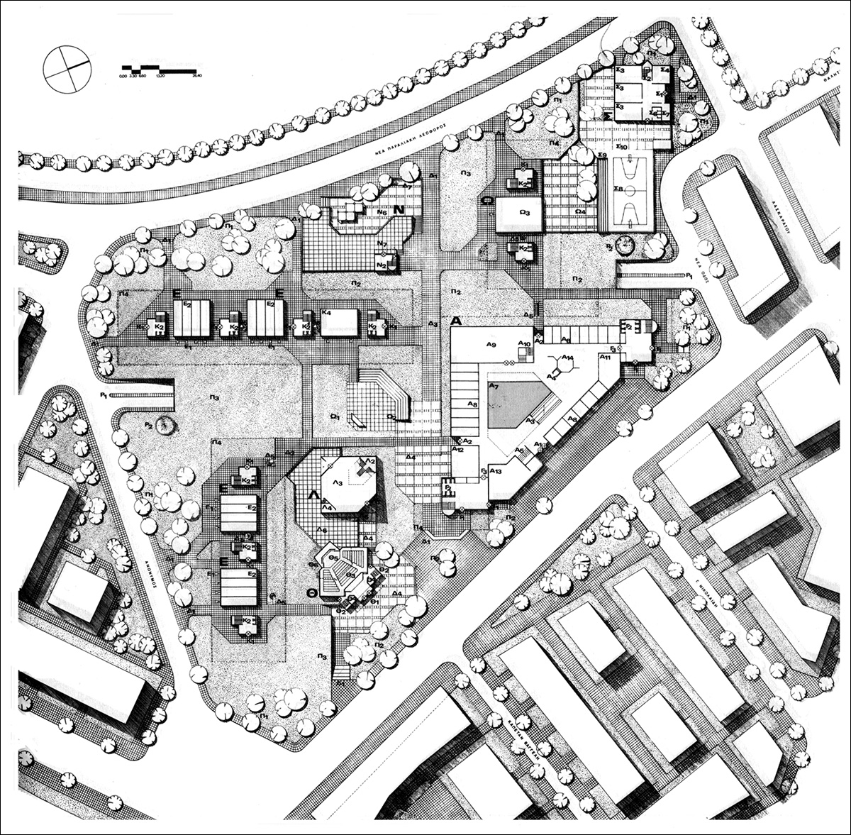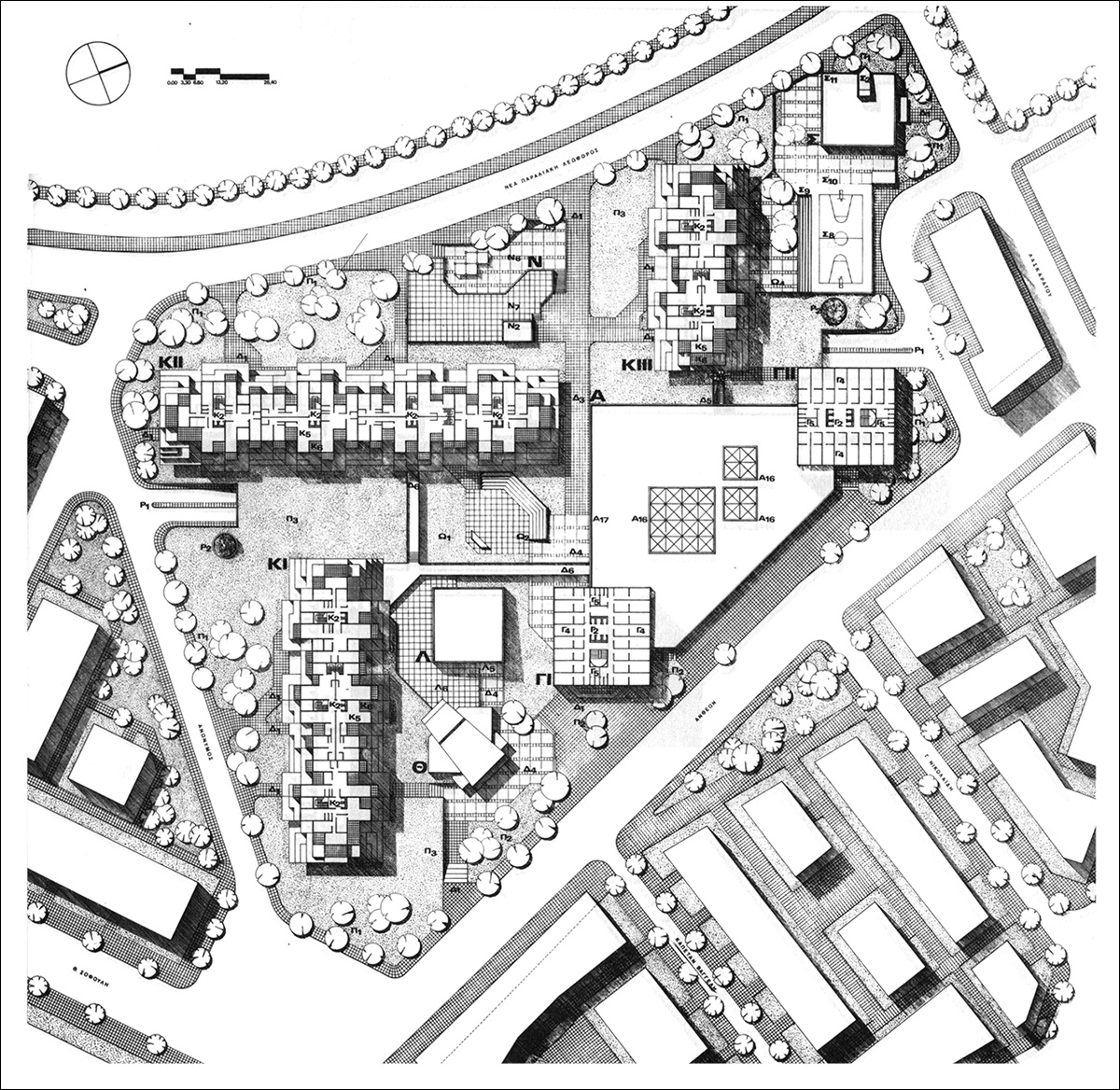 Η κατοικία, ως κύρια λειτουργία του συγκροτήματος, οργανώνεται σε τρία δεκαόροφα κτίρια (ΚΙ, ΚΙΙ, ΚΙΙΙ), με τους επτά ανώτερους ορόφους σε συνεχή εσοχή. Στη βάση των κτιρίων κατοικίας διατάσσονται διώροφες επαγγελματικές στέγες. Παράλληλα προς σην οδό Ανθέων διατάσσεται μία κλειστή τριώροφη αγορά με εσωτερικό στεγασμένο αίθριο και δύο δεκαπενταόροφοι πύργοι γραφείων. Το οικόπεδο διασχίζεται από μία ζώνη υπαίθριας αγοράς, αναψυχής και πολιτιστικών εκδηλώσεων (θέατρο, αίθουσα συναυλιών και αίθουσα εκθέσεων). Στη Ν.Δ. γωνία του οικοπέδου έχει σχεδιαστεί ένα 6τάξιο δημοτικό σχολείο. Τέλος, έχουν προβλεφθεί υπόγειοι χώροι στάθμευσης για 650 αυτοκίνητα.